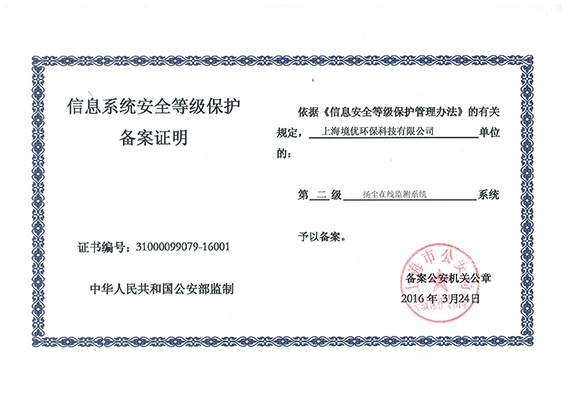 2016年3月24日,我公司开发的扬尘在线监测系统经上海市公安局检测获得信息系统安全等级保护二级备案证明
