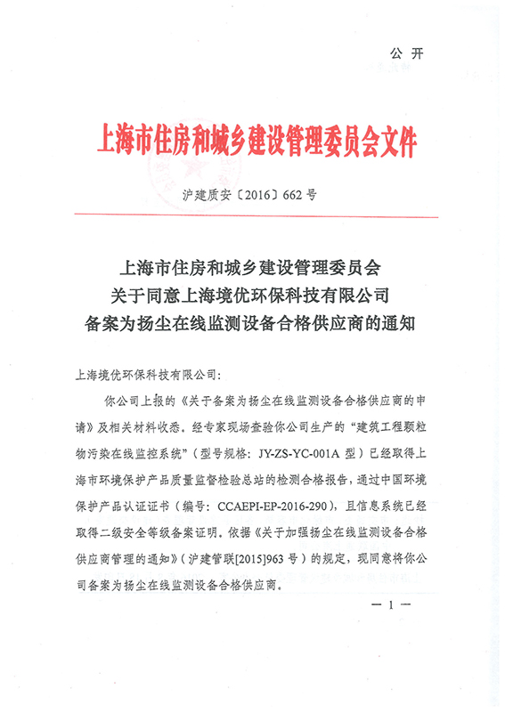 2016年8月15日,经上海市住房和城乡建设管理委员会批准,我公司正式成为上海市在线扬尘与噪声监测设备合格供应商。