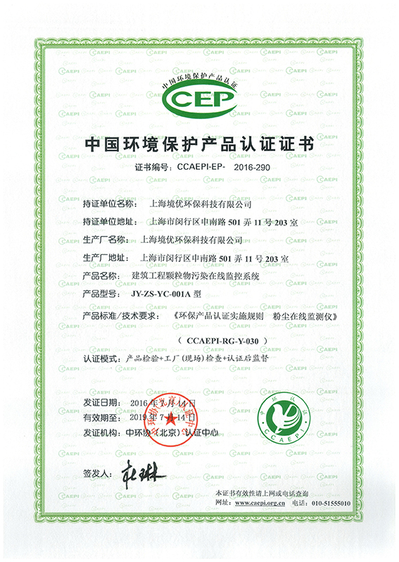 2016年7月14日,经中环协(北京)认证中心认证,我公司建筑工程颗粒物污染在线监控系统喜获中国环境保护产品认证证书,证书编号:CCAEPI-EP-2016-290。